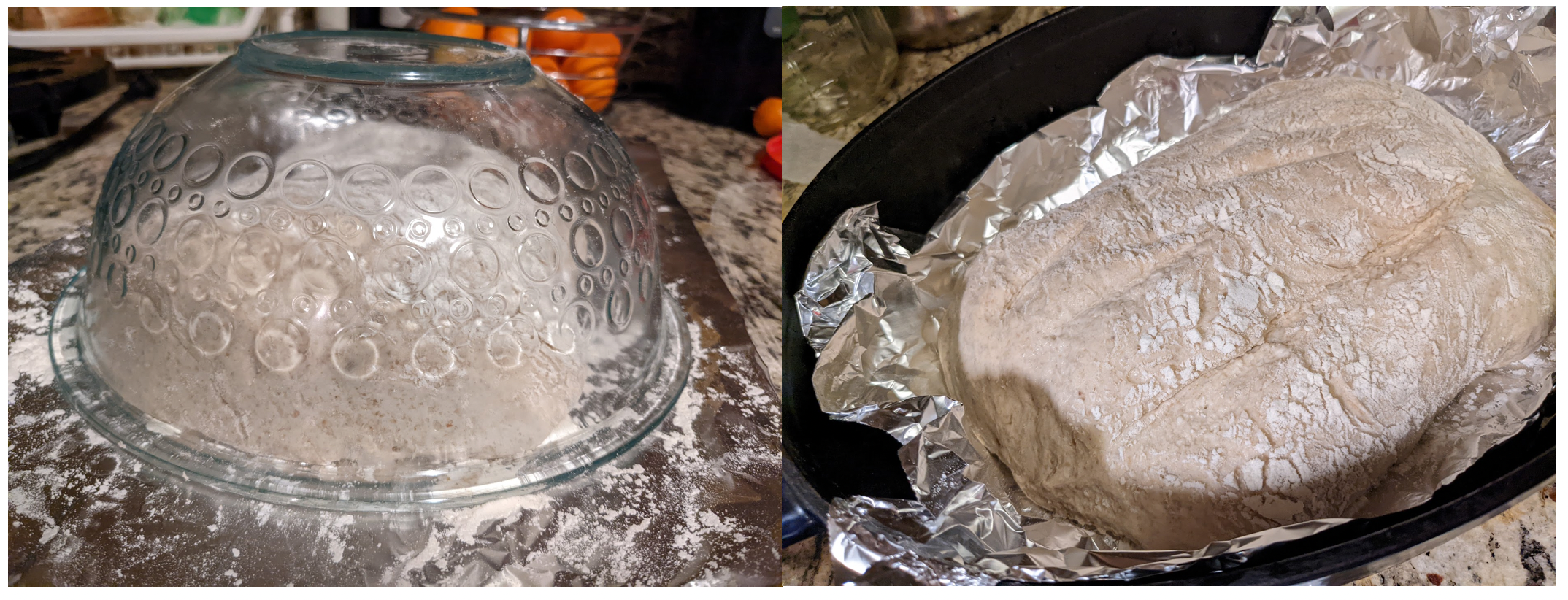 3) I found it tricky to not deflate my dough when moving it from the final proofing basket into the cast iron pot, as the turning can be a bit difficult. So I put the dough on top of aluminum foil, and put the bowl on top. Downside: no pretty circles like you’d get from a proofing bowl, as you need a glass bowl to see when the dough proofed. Upside: VERY easy to do.