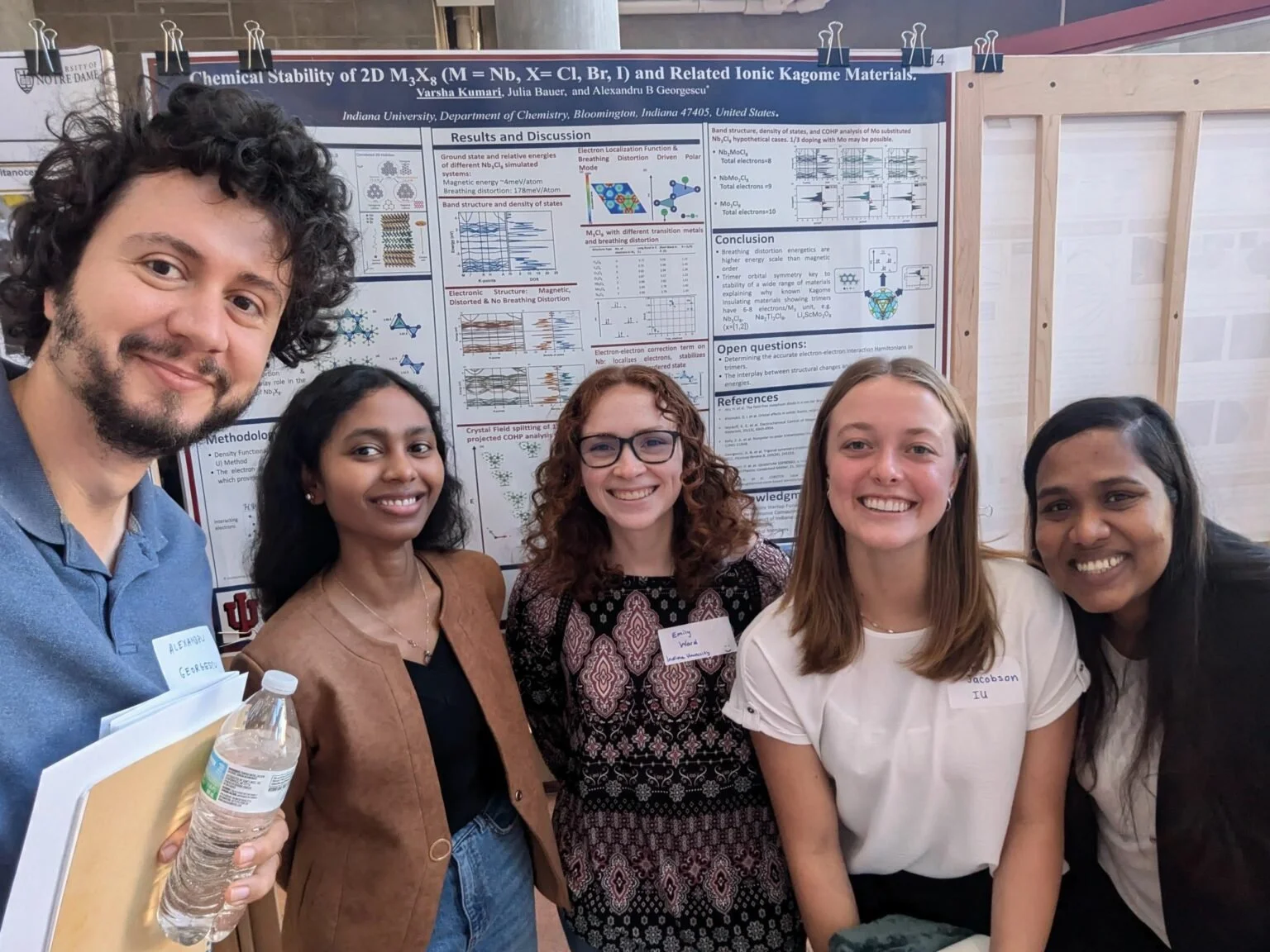 Our group members presented at multiple conferences this Fall! In November, Varsha, Emily, Carina and Bipasa all presented their posters at PINDU (see picture above), the Purdue, Indiana and Notre Dame inorganic chemistry conference. Later on, Varsha and Bipasa presented their work at the Fall Meeting of the Materials Research Society in Boston. Varsha and Bipasa each presented a poster, and Varsha also gave a talk. Varsha also won a travel award from the department supporting her travel and recognizing her high quality work on the theoretical study of trimer halide materials. Congratulations all!